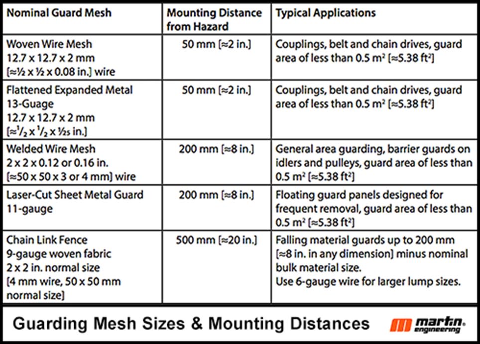 It would be far better (and safer) to standardize on a few mesh sizes and mounting distances allowing maintenance workers to build guards to a short list of materials, using standard mounting distances and eliminating the use of the gauges. Below is the recommendation included in Martin Engineering’s book FOUNDATIONS for Conveyor Safety.