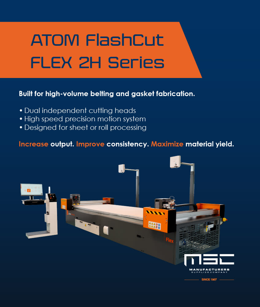 As conveyor belt applications and gasket products continue to diversify, fabricators need cutting systems that combine power, speed, and flexibility. The ATOM FlashCut FLEX 2H Series, backed by Manufacturers Supplies Company’s expertise, offers a production-ready solution that scales with business needs and supports complex cutting requirements across industries.